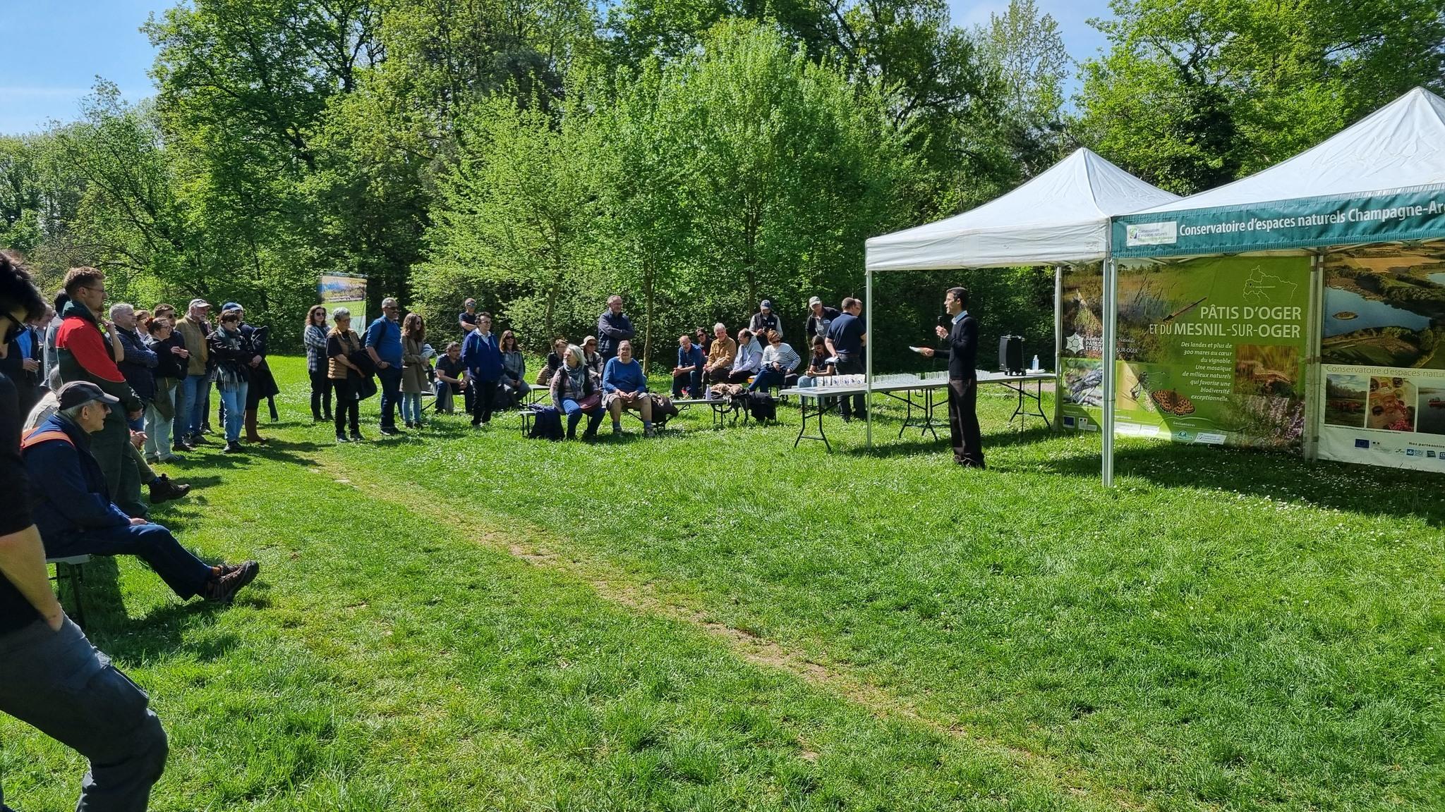 Sous un grand soleil printanier, la matinée a débuté avec une visite de la Réserve Naturelle Nationale des pâtis d’Oger et du Mesnil-sur-Oger, suivie de l’inauguration officielle des nouveaux sentiers de découverte, en présence de Lionel Berthet, directeur adjoint de la DREAL Grand Est et Thierry Robert, adjoint au maire du Mesnil-sur-Oger.