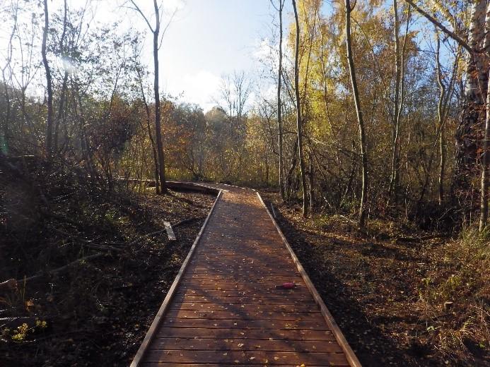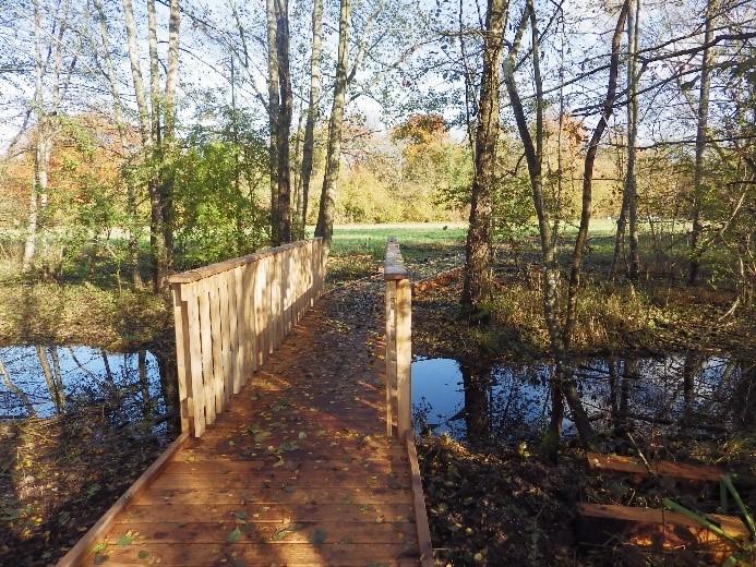 Toujours dans le cadre du projet d'accueil du public, des travaux ont été réalisés sur site afin de créer le futur sentier de découverte. Pour ce faire, un sentier a été ouvert à travers deux boisements du site et un platelage sur pilotis a été installé dans le secteur de l'étang, accompagné d'un ponton et d'une passerelle en bois.