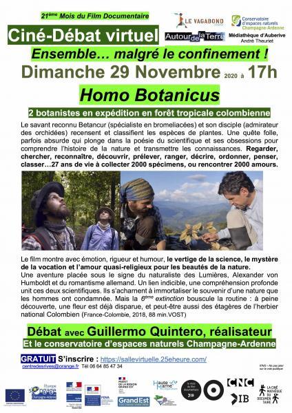 Dimanche 29 Novembre à 17h, le film « Homo Botanicus » part en expédition en forêt tropicale colombienne, avec deux botanistes-chercheurs. Un savant reconnu (spécialiste en bromeliacées) et son disciple (admirateur des orchidées) recensent et classifient les espèces de plantes. Cette folle quête plonge dans la poésie de l’homme scientifique et ses obsessions pour comprendre l’histoire de la Nature et transmettre les connaissances. Regarder, chercher, reconnaître, découvrir, prélever, ranger, décrire, ordonner, penser, classer…27 ans d'une vie à collecter 2000 spécimens, comme rencontrer 2000 amours ! Le film montre avec émotion, rigueur et humour, le vertige de la science, le mystère de la vocation et l’amour quasi-religieux pour les beautés de la nature. Un lien indicible, une compréhension profonde unit ces deux scientifiques, qui s’acharnent à immortaliser le souvenir d’une nature que les hommes ont condamnée. Mais la 6ème extinction bouscule la routine : à peine découverte, une fleur est déjà disparue, et peut-être aussi des étagères de l’herbier national Colombien (France-Colombie, 2018, 1h28. VOST).