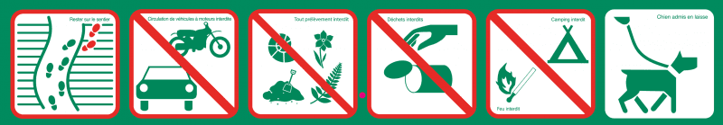 Ils signalent aux usagers qu’ils entrent dans un site naturel protégé possédant sa propre réglementation. Les principales interdictions y sont ainsi rappelées par des pictogrammes.