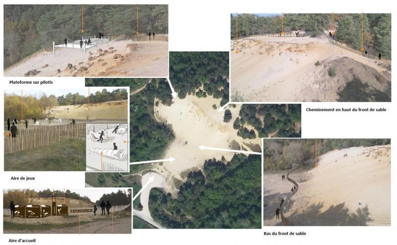 Le front de sable de la Grande Sablière reste le secteur le plus fréquenté par les usagers du site. Il s’agit toutefois du secteur le plus sensible du point de vue de sa géologie et de sa biodiversité. Il est donc prévu d'en limiter l’accès en le mettant en défens. Le public pourra néanmoins continuer à découvrir le front de sable grâce à un chemin aménagé de façon à en limiter l'impact pour le paysage ainsi que l'érosion au sol. De plus, un panorama sera maintenu grâce à l'installation d'une plateforme sur pilotis en bois qui doit permettre aux usagers d'observer la géologie du site et notamment ses bancs de grés.
