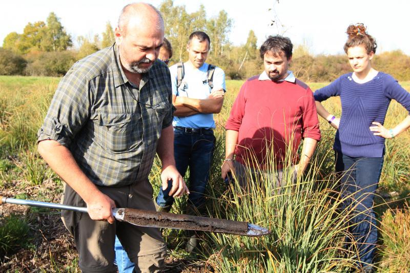 Les 30 participants se sont ensuite rendus sur le Marais de Reuves pour une approche plus ludique : démonstration de l'utilisation d'une sonde pour prélever de la tourbe sans perturbation (appelée carrotirus), observation des différents types de tourbe, ... mains noires garanties en fin d'après-midi !